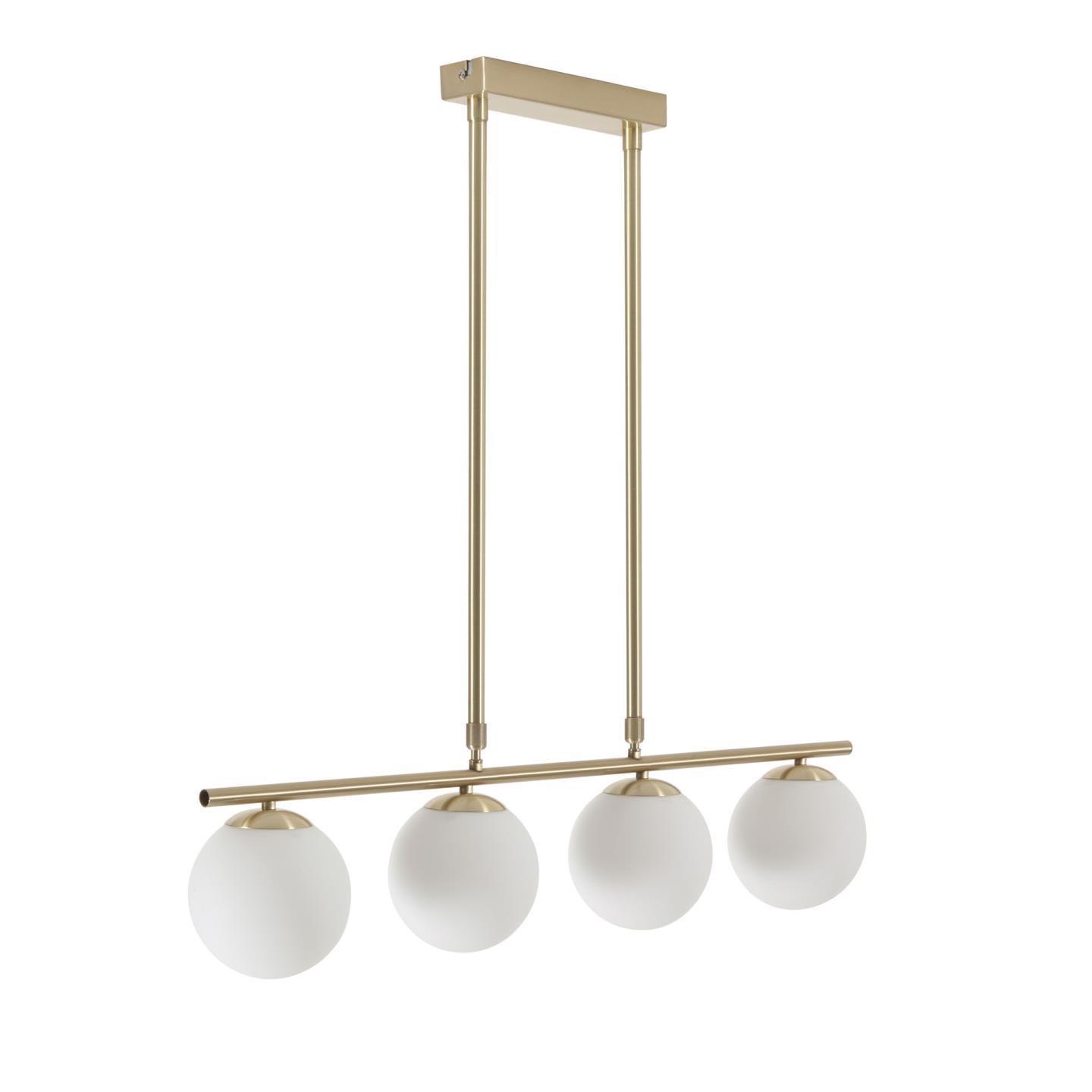 Modern design en geometrische vormen gaan perfect samen in Mahala's vier bolvormige tinten in matglas en met messing afgewerkte stalen details. De perfecte manier om elke kamer stijlvol te verlichten.- Stalen plafondlamp met staal in messing afwerking en mat glas.