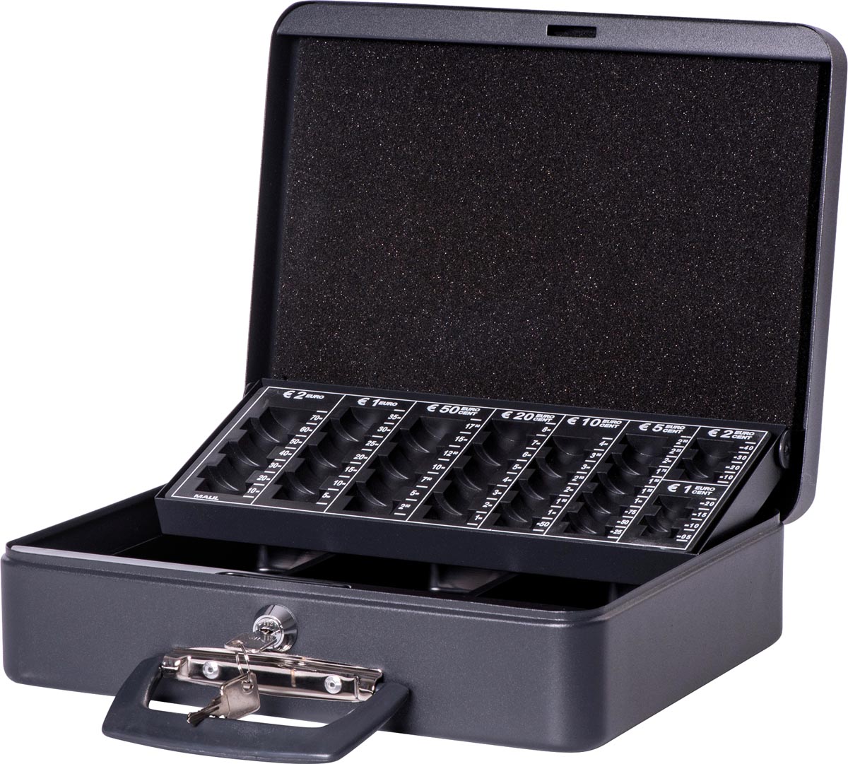 ProductinformatieUit gelakt staal Uitneembaar, 3-delig vak voor bankbiljetten Met euromuntinzet Veiligheidscilinderslot (inclusief 2 sleutels) Kleur: zwart