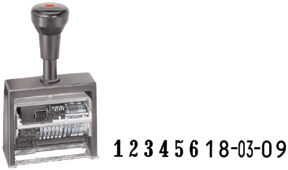 Datum-nummerstempel (datum rechts). Moderne onbreekbare montuur in kunststof. Lichte uitvoering. Nummer: 6 rijen cijfers, 0, 1, 2, 3, 4, 5, 6, 12 + 20x herhalend, met of zonder nullen (lettertype: Antiqua). Datum: rechts in cijfers (lettertype: blok). Nummer verspringt automatisch, datum is verstelbaar met stift. Schrifthoogte: 4,5 mm. Inktkleur: zwart of rood.