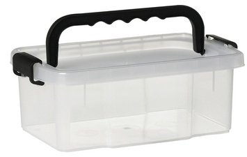 ProductinformatieTransparante, dekselkoffer, materiaal: PP, met zwarte sluitclips, groot handvat met uitsparing voor de vingers voor gemakkelijk transport, geschikt voor voedselcontact, stapelbaar, afmetingen: (L)375 x (B)285 x (H)168 mm.