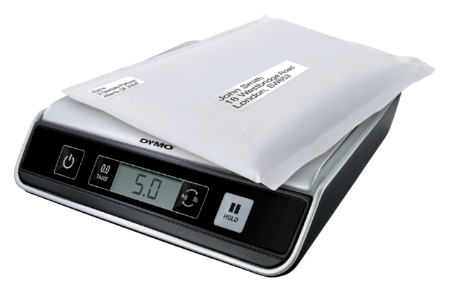 * Dymo digitale weegschaal. * Eenvoudig te bedienen digitale weegschaal voor het wegen van brieven en pakketjes. * Compact. * lcd-scherm. * Tarrafunctie biedt de mogelijkheid om zonder het gewicht van de container af wegen, wanneer objecten in een container gewogen worden. * Hold-kKnop voor het opslaan van het gewicht, zodat het gewicht van grotere omslagen en pakketten gemakkelijker afgelezen kan worden. * Automatische uitschakeling spaart batterijen. * Weegt per 2 gram. * Gebruikt 3 AAA-batterijen (niet meegeleverd). * Met USB-aansluiting.