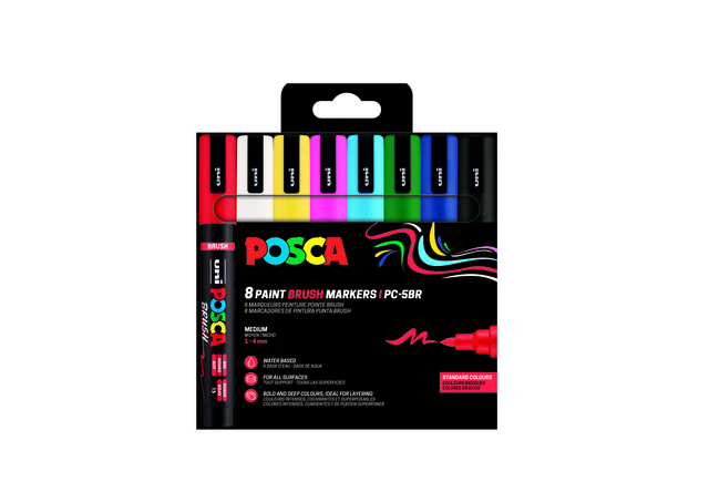 * De Uni Posca Paintmarker PC-5BR Brush heeft een brush punt van 1-4 mm. * Posca markers zijn toepasbaar op papier, plastic, glas, textiel, hout, steen, porcelein enzovoorts.* Perfect om unieke ontwerpen mee te maken, voor zowel binnenshuis als buitenshuis. * De pigment-houdende inkt is op water basis en is reukloos in gebruik. * Geschikt voor alle ondergronden. * Hoge UV weerstand. * Dekkende ondoorzichtige kleuren. * Uitwasbaar. * Mengbaar. * Aquerelleerbaar. * Overschilderbaar. Set à 8 kleuren.