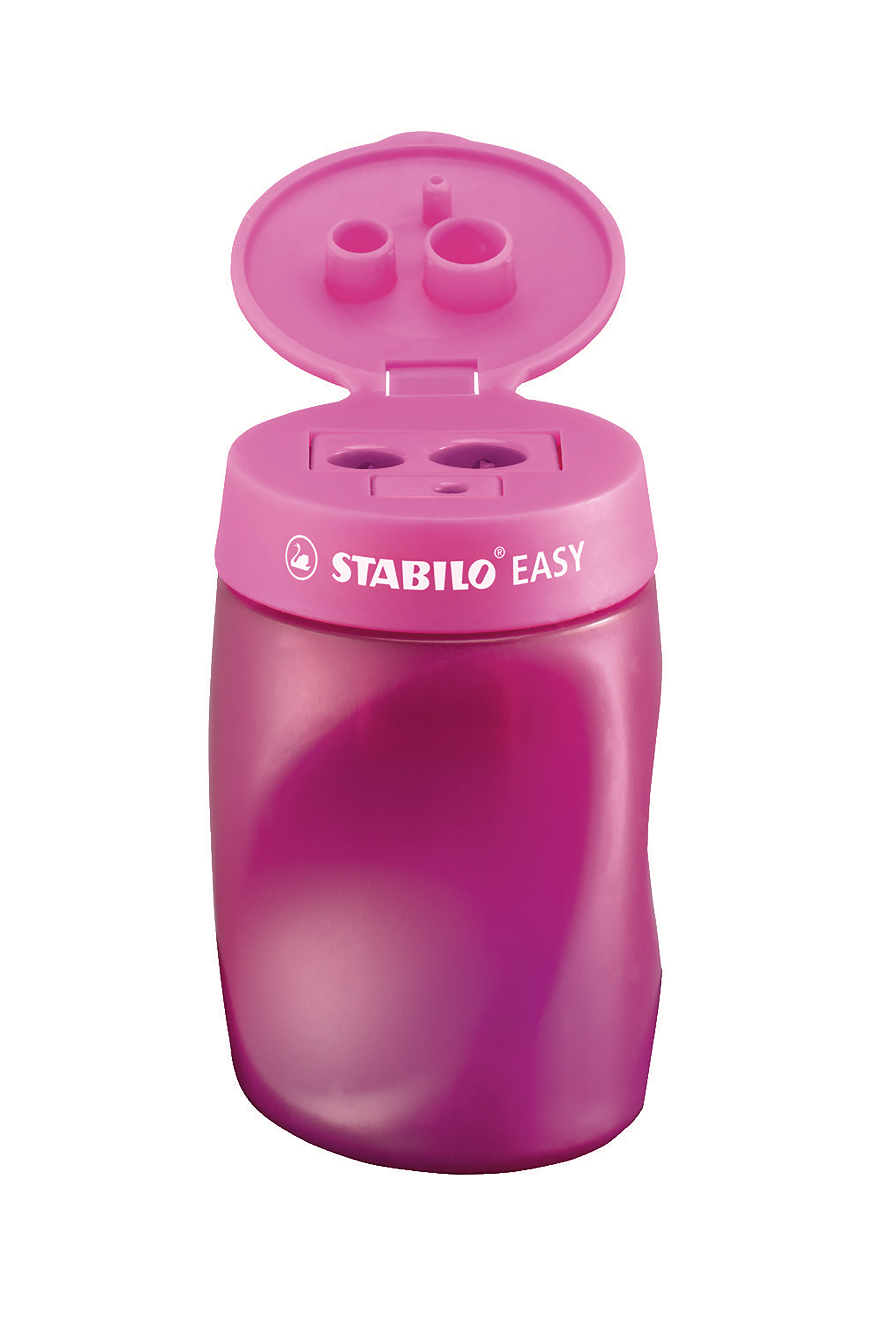 De Stabilo EasySharpener is een ergonomische puntenslijper: de vorm en de slijprichting zijn verschillend afhankelijk van de versie (voor rechtshandigen of linkshandigen).