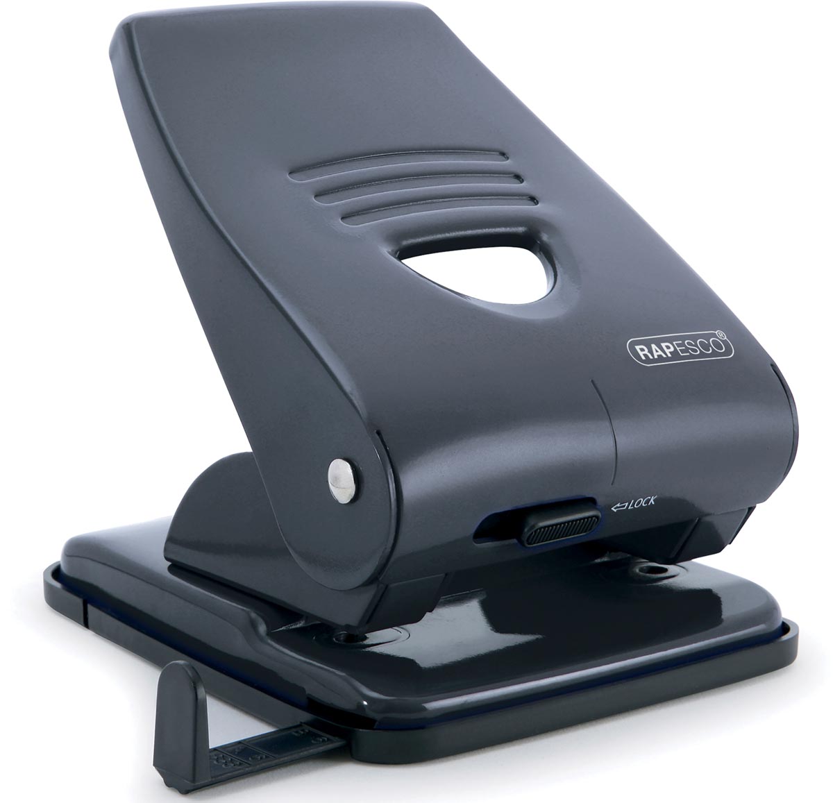 Rapesco 835 metalen perforator voor hoge prestaties biedt robuust metalen onderdelen, precisie, verharde stansen, een geïntegreerde vergrendeling voor ruimtebesparend opbergen en een metalen onderbouw met rubberen klep voor het opvangbakje. Perforeert tot40 vellen van 80 g/m², voor een lange levensduur. Kleur: Zwart