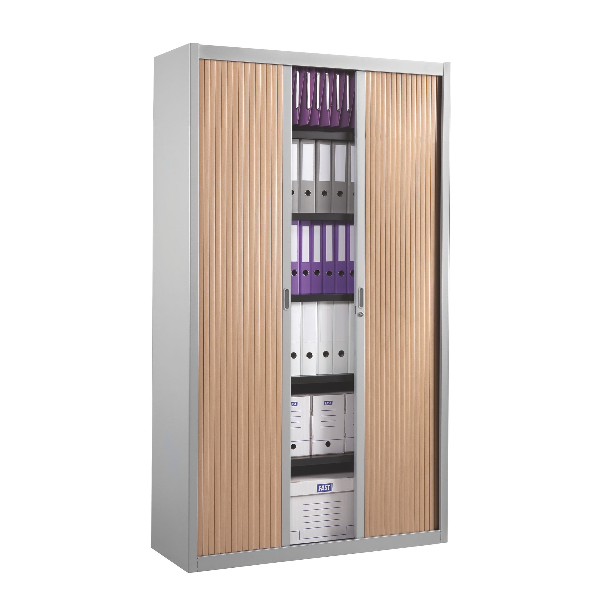 Met een grote capaciteit is deze hoge decoratieve rolluikkast ideaal om al uw dossiers op kantoor op te bergen.