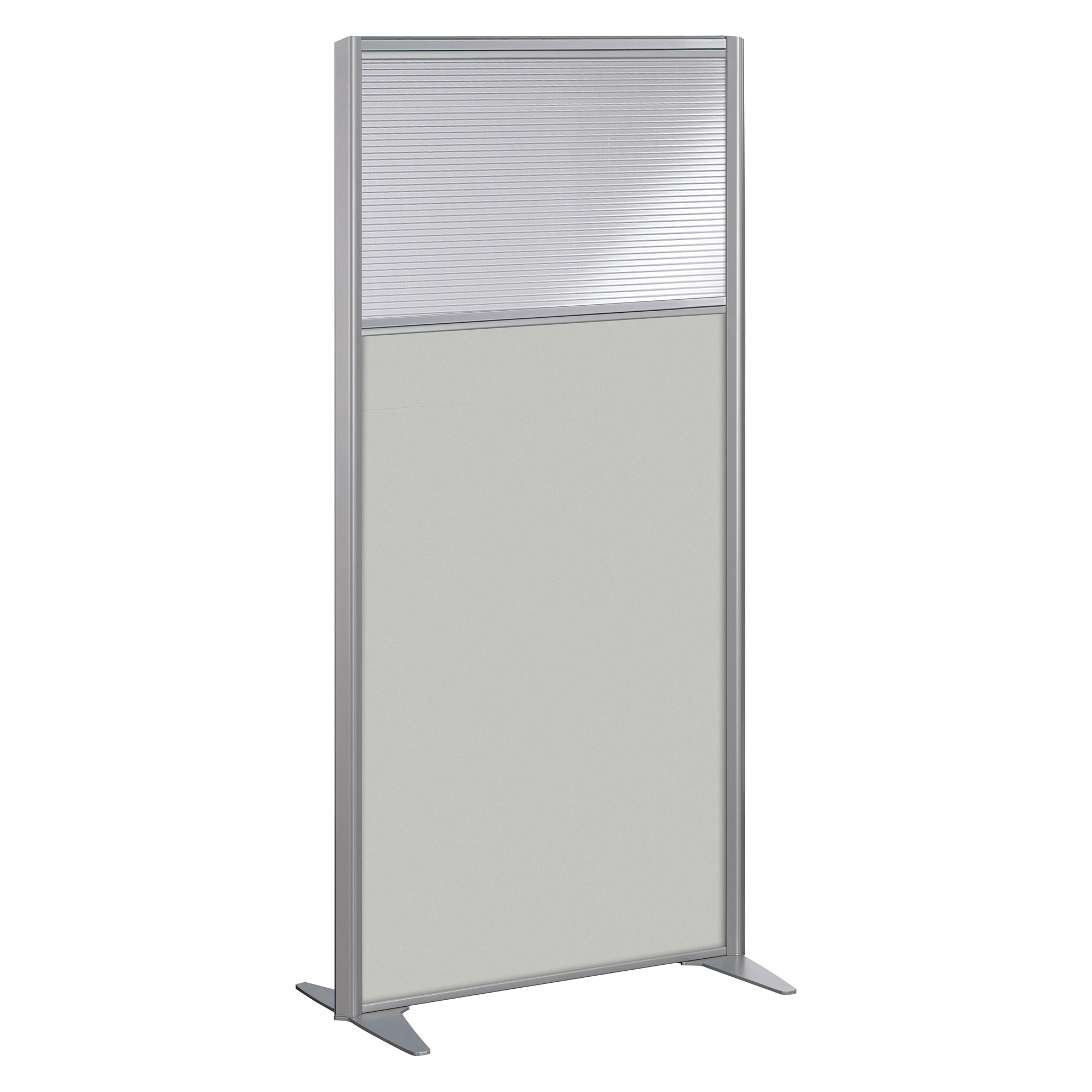 Verstelbare krikken om oneffenheden op de bodem te compenseren. Een dragend frame in aluminium en zilvergrijs staal: de scheidingswand heeft een klassieke stijl die geschikt is voor een professionele omgeving.
