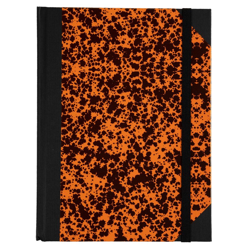 ProductinformatieOranje gemarmerd notitieboek, gelinieerd, 192 pagina's, 22 x 17 cm, met een zwart elastiek om sluiting te garanderen, velijnpapier 90 g.