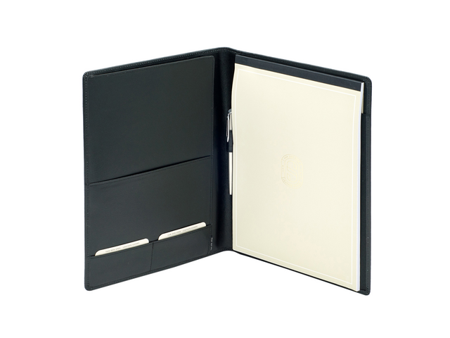 Productinformatie* Luxe lederen A4 schrijfmap. * Inclusief A4 schrijfblok met 50vel 80gr wit schrijfpapier. * Met A4 insteek flap, A5 vak en 2 visitekaartvakjes. * Elastische penlus (pen niet inbegrepen) en schrijfblok insteek. * Formaat 323x236mm.