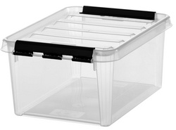 ProductinformatieDoos met deksel, kleur: transparant, clipszwarte sluitingen, afmetingen: (B)250 x (D)340 x (H)160 mm,materiaal: PP.