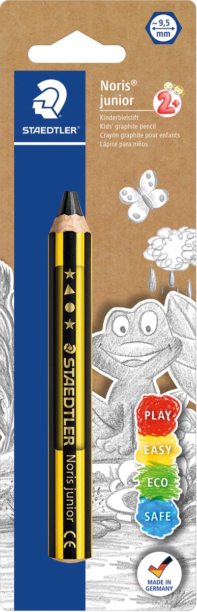 ProductinformatieHet perfecte eerste kinderpotlood in extra breed formaat. Geel-zwart Noris design. Hardheidsgraad 2B. Extreem breukvast dankzij de zeer dikke kern. Hout van gecertificeerde, verantwoord beheerde wouden (PEFC).