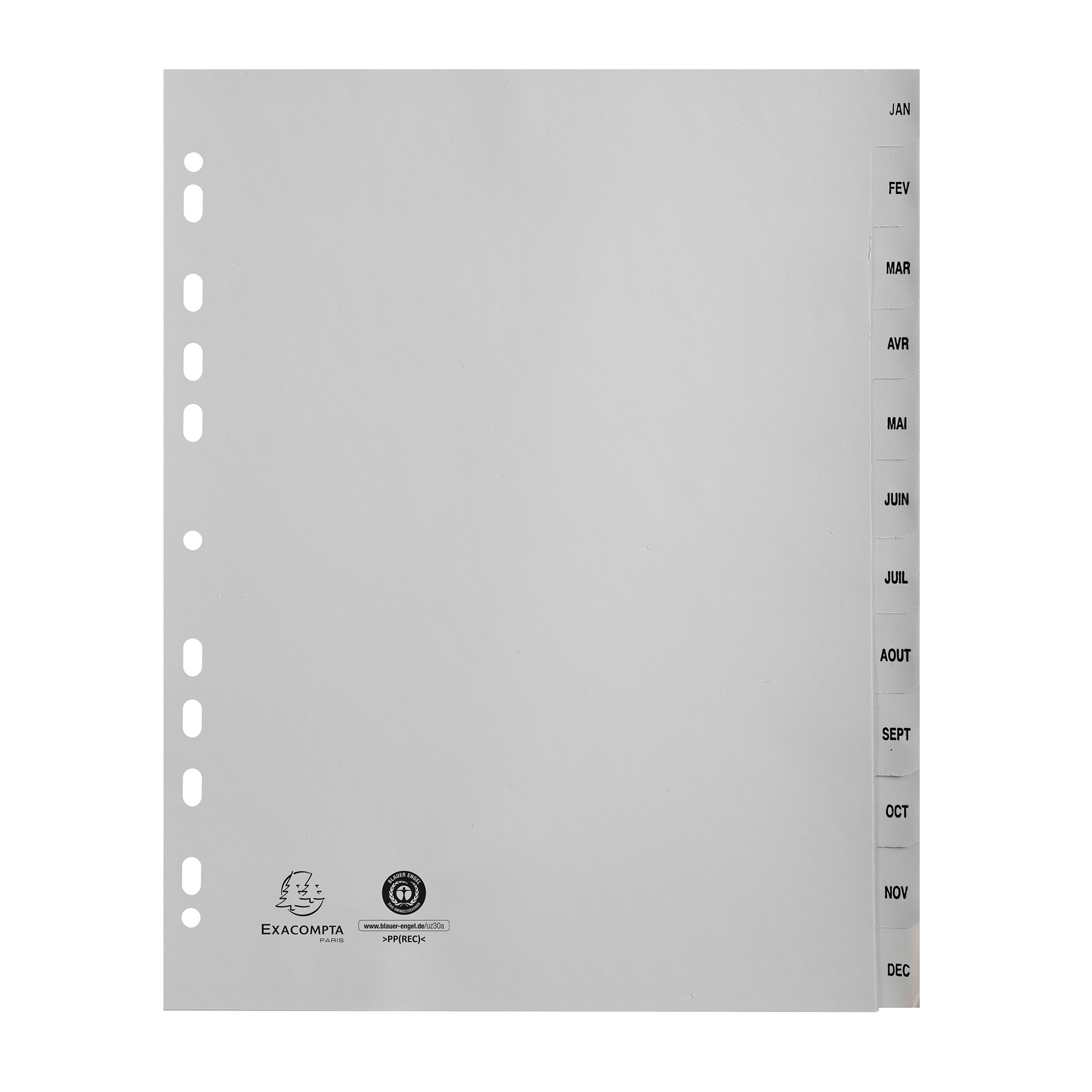 ProductinformatieVoor een geslaagde maandelijkse classificatie, kies voor het tussenblad van Exacompta.Voordelen:12 tabbladen maandelijks bedrukt van Januari tot December in gerecycled grijs polypropyleen, flexibel en onscheurbaarA4 Maxi formaat, ideaal voor het organiseren van geperforeerde hoezen in A4+ ringbanden