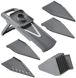 ProductinformatieKleur: zilver/grijs, materiaal: roestvrij staal, ABS-kunststof, extra scherpe messen, incl. inkepingen en bescherming voor de vingers, inklapbare voet, ook geschikt voor harde groenten, afm.: (L)143 x (B)385 x (H)133 mm.