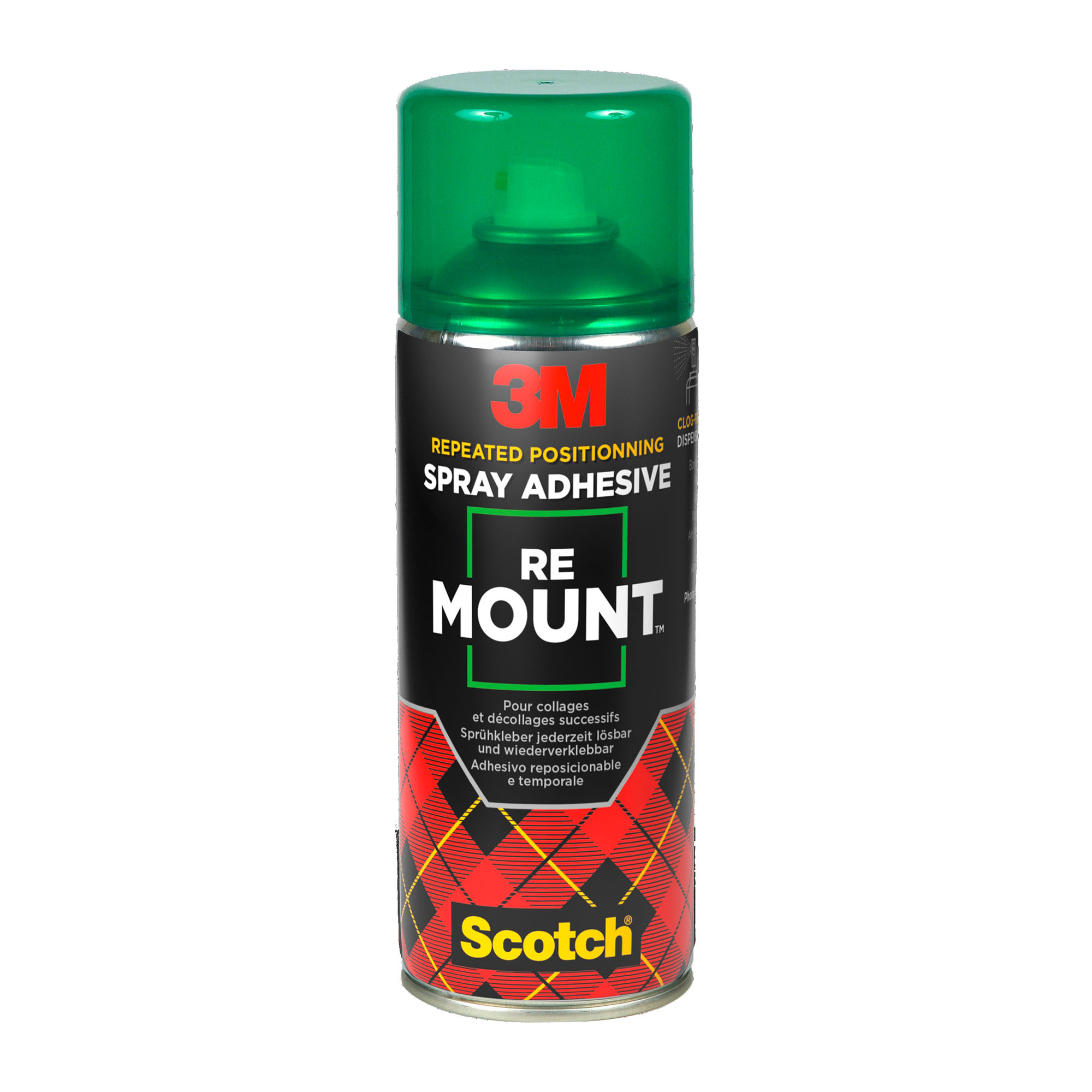 ProductinformatieVoor modelbouw, tekeningen, papier, foto's... 4 formules (herpositioneerbaar type "Post-it", herplaatsbaar enkele uren, permanent, permanent decoratief). Spuitbus van 400 ml.