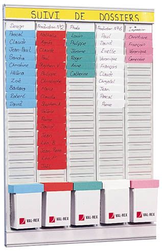Planbord met 8 banden en 24 vakjes.Geleverd met 700 T-kaarten van 60 mm (ind.2),100 T-kaarten 28 mm (ind.1) en etiketten voor de titels. Kan op alle ondergronden bevestigd worden. Geleverd met hechtingen en haakjes. Afmetingen: 48 x 48 cm.planningsbordplanborden. planbord